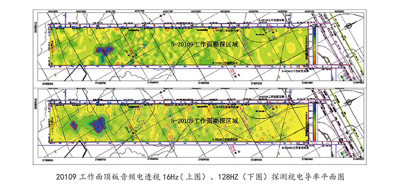 本次音频电透视探测查明了20109工作面顶板的水文地质条件,圈定了富水区位置及范围。根据探测结果进行了钻探验证,在两处异常区(Y-YC1、Y-YC2)都有出水现象。