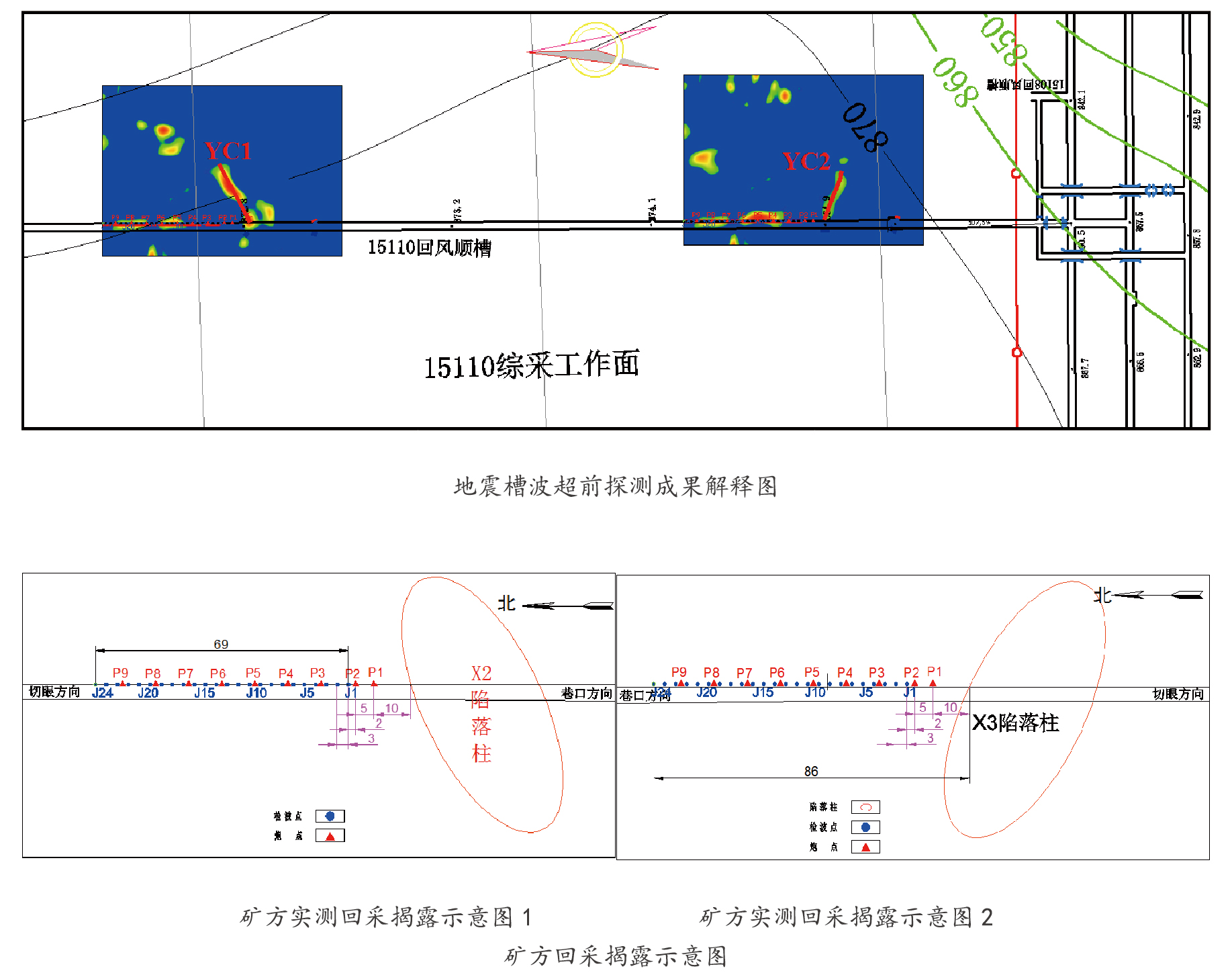 巷道掘进共揭露X2和X3两个陷落柱,槽波超前探测解释异常YC1与揭露陷落柱X2位置基本一致,YC2与揭露陷落柱X3位置基本一致。