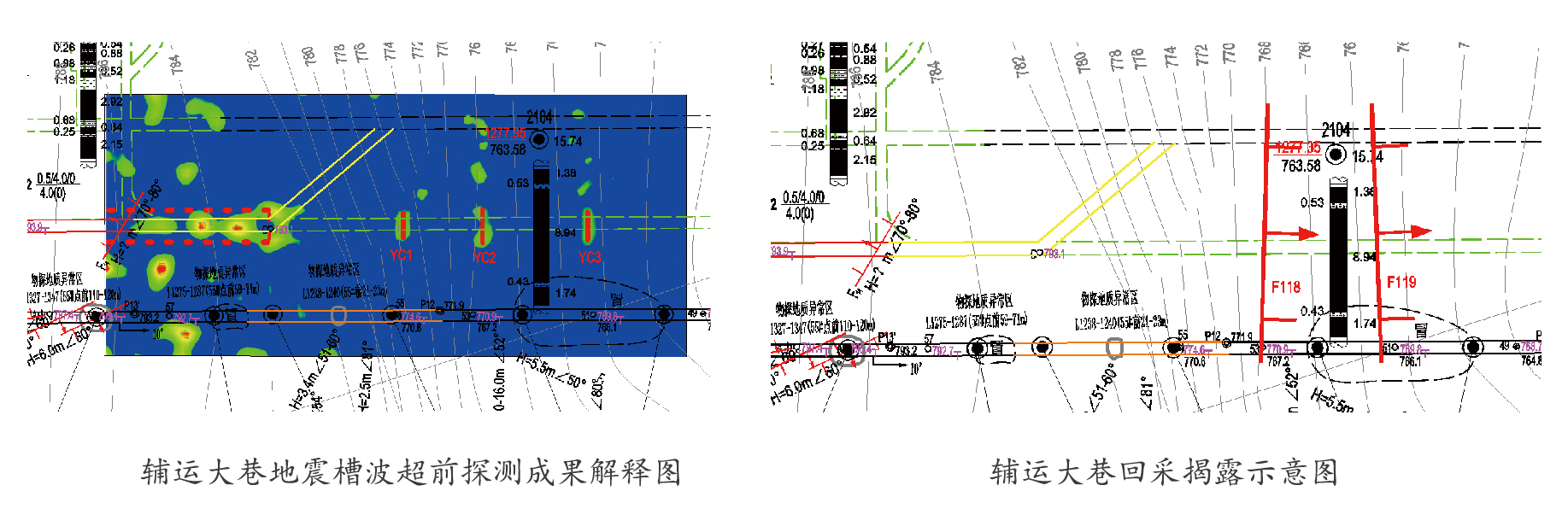 回采结果表明F118和F119断层为辅运大巷和回风巷两条巷道揭露的断层。断层位置及走向与地震槽波超前探测推断解释的YC2、YC3异常空间位置、走向基本一致。