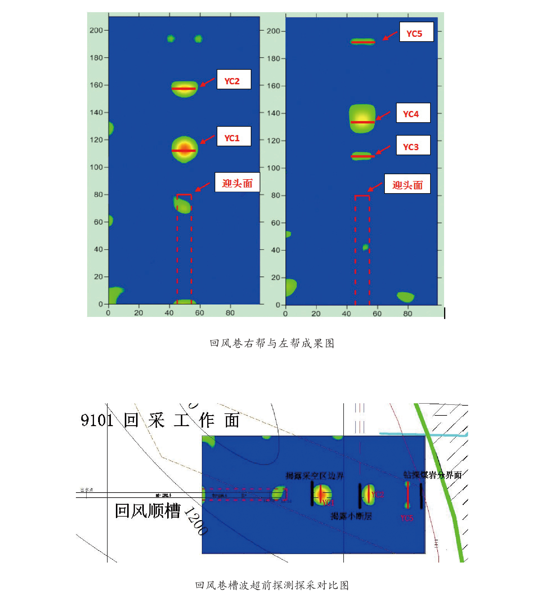 结合左帮和右帮成果图,推断前方存在3处地质异常YC1、YC2、YC5。矿方在迎头30米、70米和110米揭露出异常,实际揭露位置与槽波超前探测距离基本吻合。