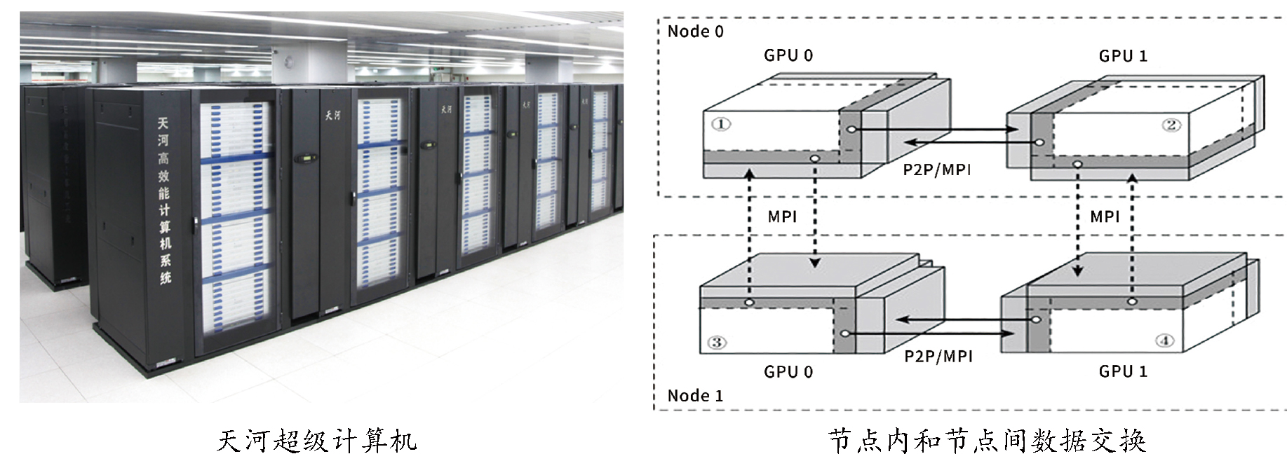 地震全波形反演过程中需要进行大量计算和数据存储。技术应用世界领先的天河超级计算机,采用模型域分割实现多个 GPU 并行计算;采用 CUDA 和 MPI 并行实现多节点多 GPU 并行;采用 CUDA 流、GPUDirect、NVLink 等 GPU先进技术提高反演计算效率。