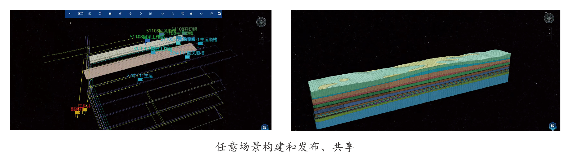 支持采掘场景构建,支持沿采掘巷道方向或任意方向的剖切,对采掘工作面地质条件进行预测预报,辅助采掘生产。