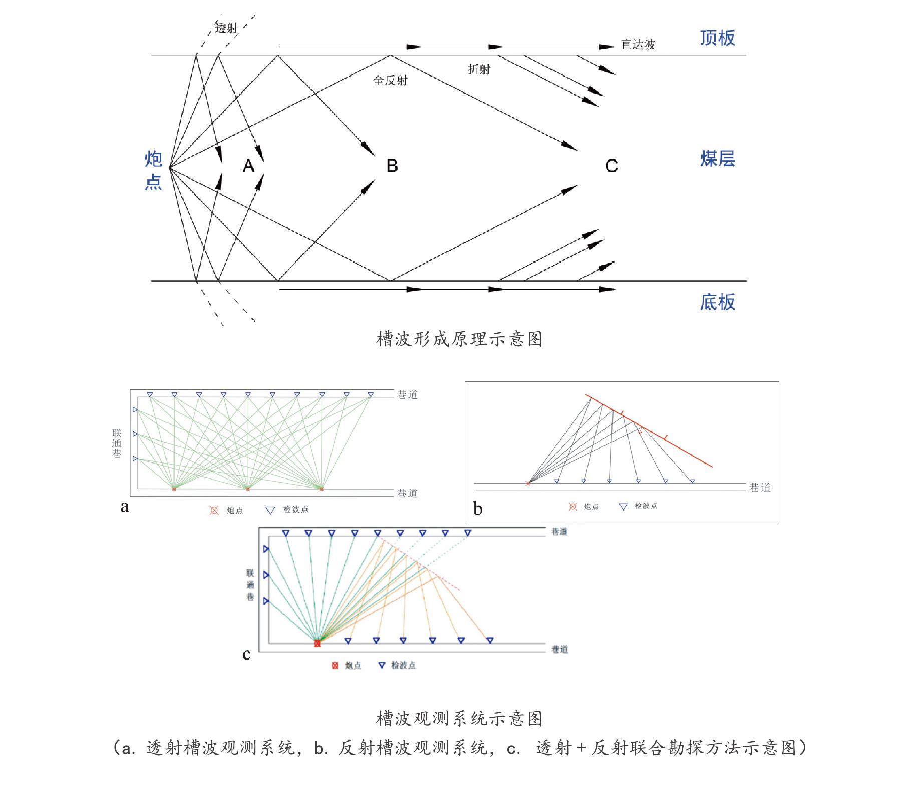 在含煤地层中,煤层的密度比顶底板围岩的密度小,地震波在煤层中传播速度比在顶底板岩石中传播速度低。煤层中激发的地震波,部分能量经煤层顶底板多次全反射,互相叠加干涉,形成槽波。槽波是只在煤层内传播的地震波,当采煤工作面内有断层、陷落柱、冲刷带等地质异常时,沿煤层传播的槽波会产生反射、折射、散射。在巷道煤壁或钻孔中安装检波器,可接收到透射槽波或反射槽波并传到地震仪记录下来,对数据处理分析后,可判断地质异常的位置、规模等信息。槽波勘探可分为透射槽波勘探、反射槽波勘探及透射+反射联合勘探方法。