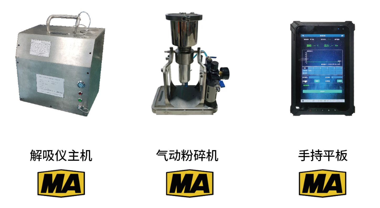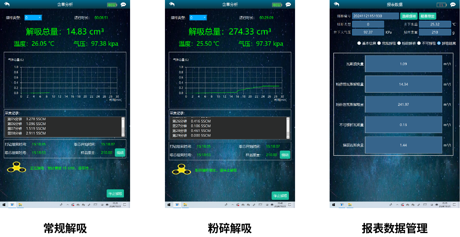 仪器由主机、平板电脑、智能化嵌入式软件、气动粉碎装置及其附属部件组成,体积小、重量轻。仪器在煤矿井下通过压风驱动气动粉碎装置直接粉碎煤样,解吸仪自动实现瓦斯参数自动采集、测定、传输,测定过程速度快,且免了人工读数和记录造成的误差。平板电脑端智能化嵌入式软件实时对测定数据进行储存和管理。